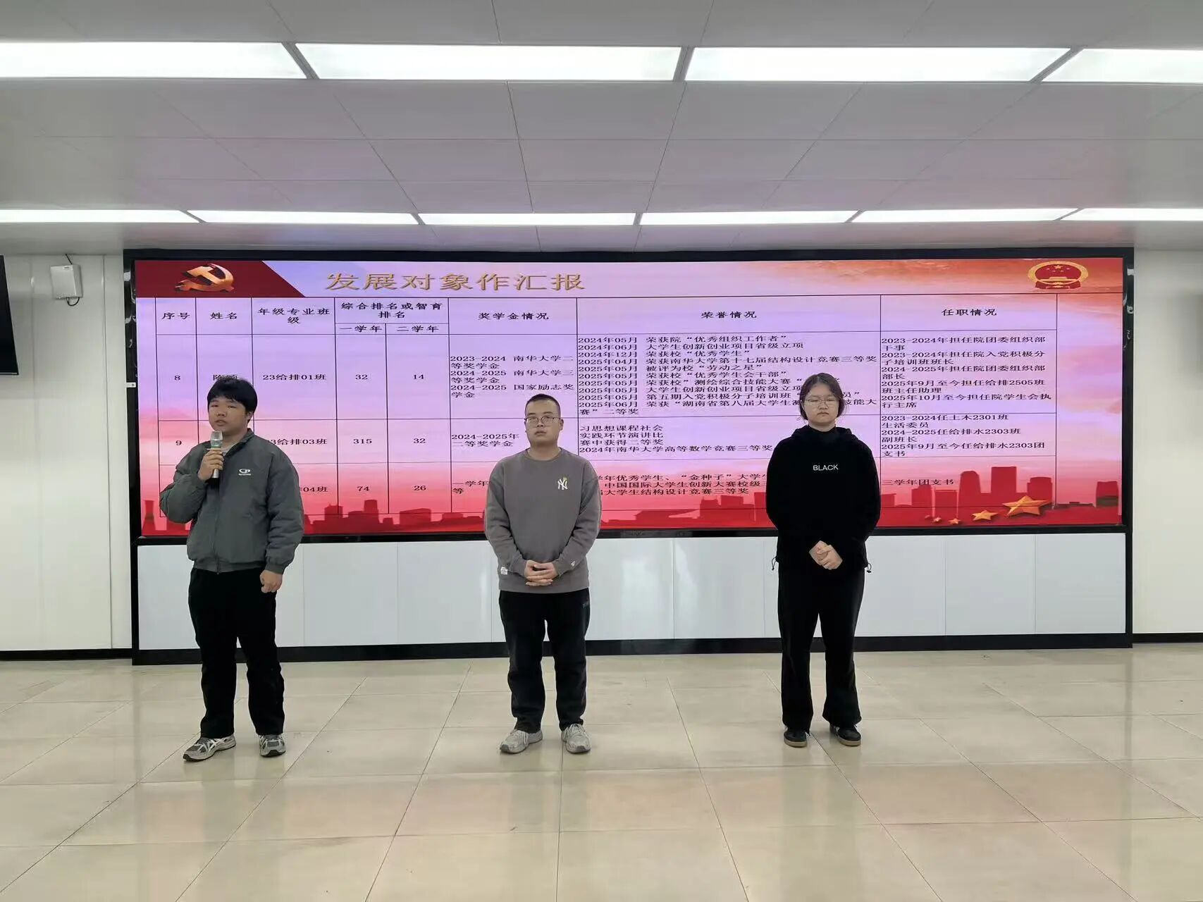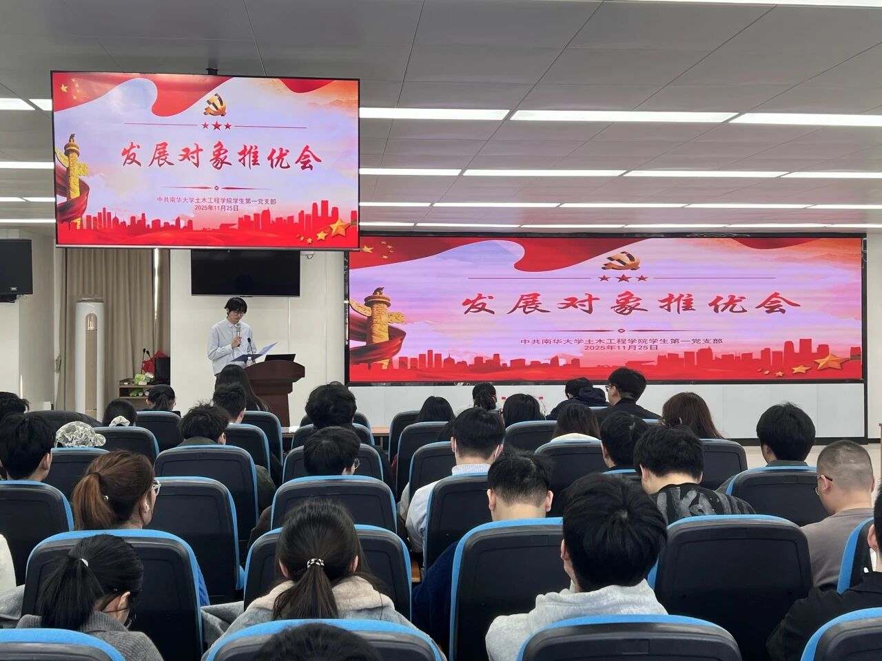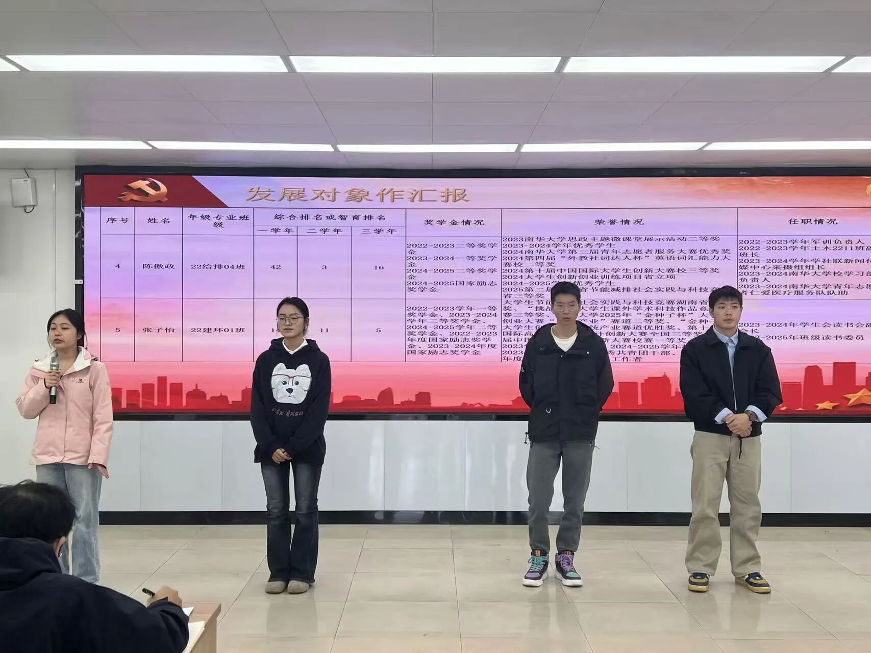 2025年11月25日下午15:00,南华大学土木工程学院学生第一党支部于土木楼六楼会议室顺利召开2025年秋季发展对象推优入党、群众座谈会。出席本次会议的成员有党支部书记贺淑珍同志,辅导员严铖磊老师,土木工程学院学生第一党支部党员,2022、2023级给排建环群众代表以及发展推优对象。会议由罗佳棋同志主持。