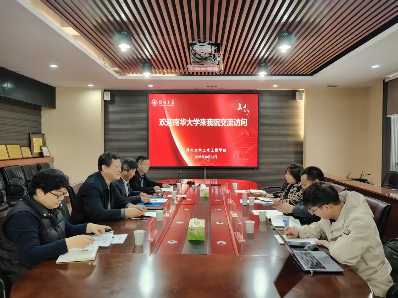 10 月 31 日,南华大学土木工程学院副院长刘清带队,规划基建处副处长甘元初、智能建造与智慧交通专业智慧交通系主任贺其博士、智能建造教研室主任彭成博士一行 4 人,赴河南郑州郑州大学土木工程学院,围绕智能建造与智慧交通专业人才培养、课程体系建设和实验室建设等方面开展调研。